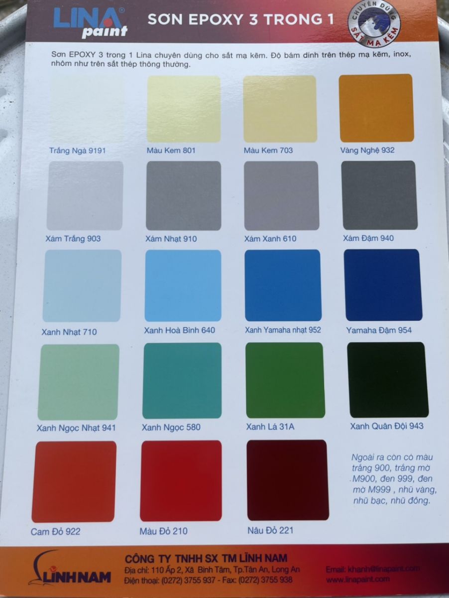 – Màu sắc của sơn kẽm Lina thì theo bảng màu của sơn Lina và có thể pha màu theo yêu cầu khi có mã màu cụ thể.