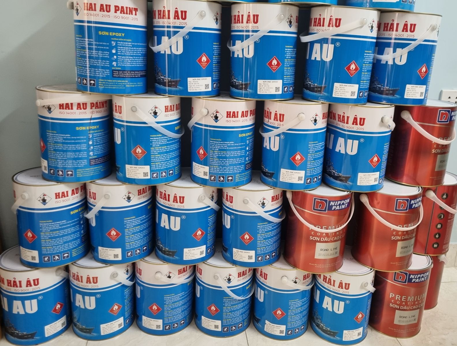 - Màu sơn phủ Hải Âu: Xanh dương (352), cam (586), vàng (653), đỏ (555), trắng (790), đen (450)…